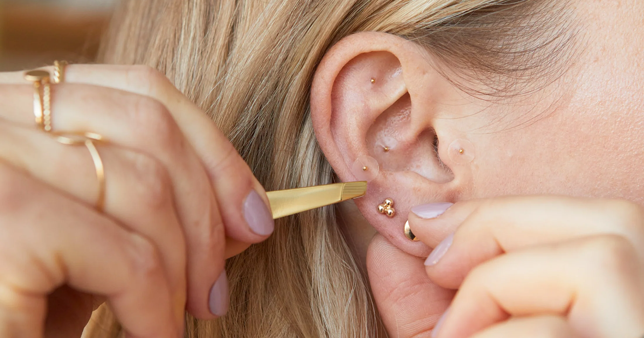 Hands holding tweezers and a strip with small circular objects.Smiling person with blonde hair in a light-colored shirt, indoor setting with shelves.Person inserting an earring into another person's ear.