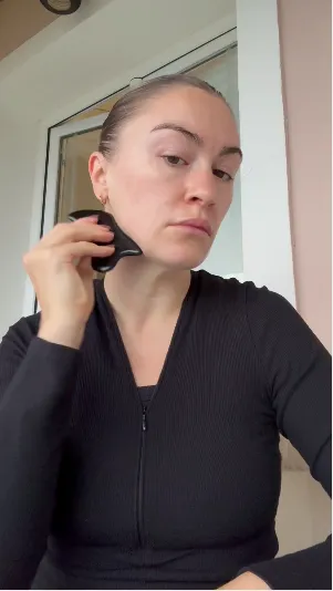 Sculpt & lift — Glide the tool upwards and outwards along the face, jawline, and neck, finishing with gentle downward strokes on the neck to support lymphatic flow and relaxation.