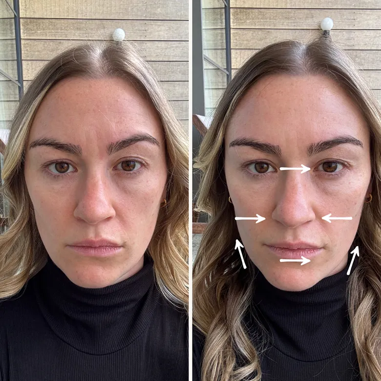 Glide upwards and outwards — chin to ear, cheek to temple, brow to hairline.